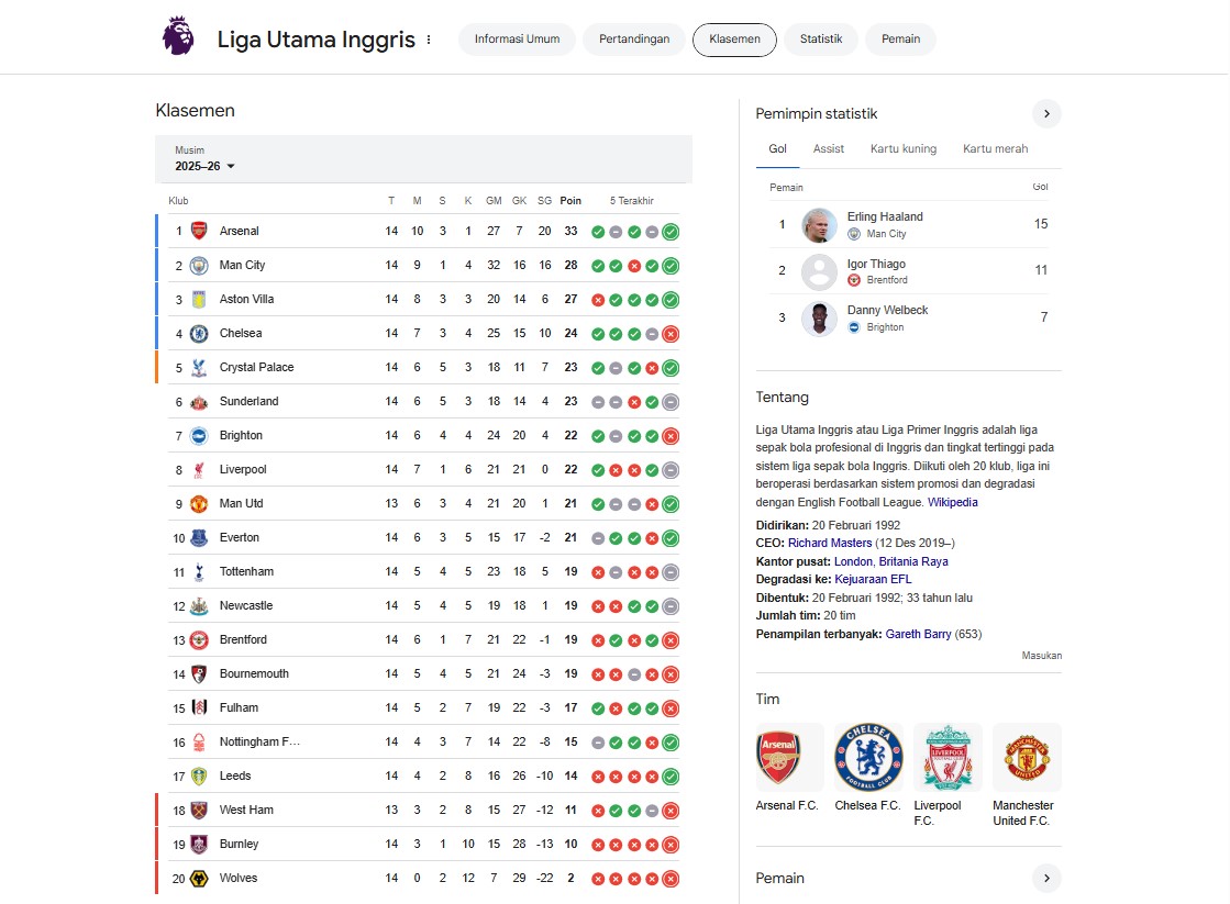 📰 Arsenal Kukuh di Puncak, Persaingan Empat Besar Memanas: Sorotan Klasemen Liga Inggris Pekan Ke-14