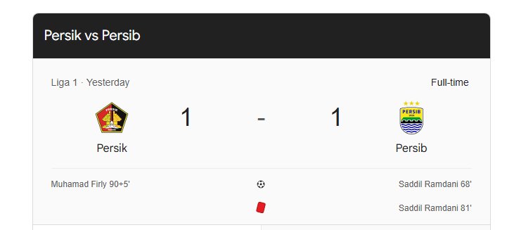 Laga Persik Kediri vs Persib Bandung berakhir dengan skor 1-1 dalam pertandingan penuh drama, emosi, dan determinasi. Gol Saddil Ramdani di menit ke-68 sempat membawa Persib unggul, namun kartu merah di menit ke-81 menjadi titik balik. Persik Kediri memanfaatkannya dengan sempurna lewat gol dramatis Muhamad Firly di menit 90+5.