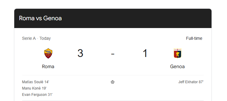 Gol ketiga Roma menjadi momen penentu yang mematikan harapan Genoa. Melalui skema serangan rapi dan eksekusi yang sempurna, Roma memastikan kemenangan 3-1 dengan gaya meyakinkan. Stadion Olimpico pun bergemuruh menyambut kemenangan penting ini.
