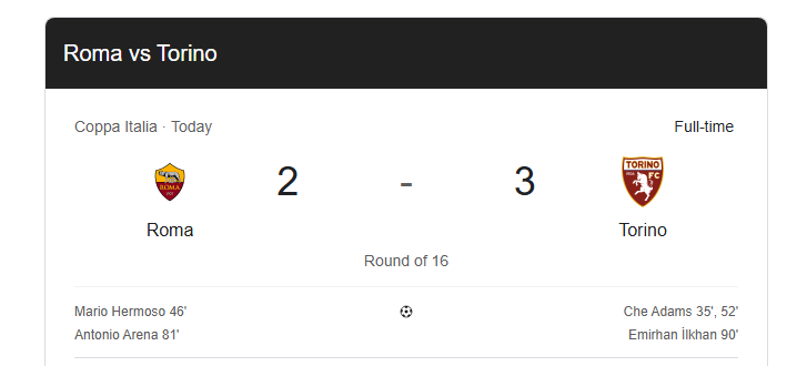 AS Roma datang ke laga ini dengan ambisi besar untuk melaju lebih jauh dan menjaga asa meraih trofi. Namun Torino FC tampil tanpa rasa gentar. Mereka bermain efektif, disiplin, dan mampu memanfaatkan setiap celah yang ditinggalkan lini pertahanan Roma. Hingga peluit akhir dibunyikan, Torino FC keluar sebagai pemenang, sementara Roma harus mengubur mimpi mereka di Coppa Italia musim ini.